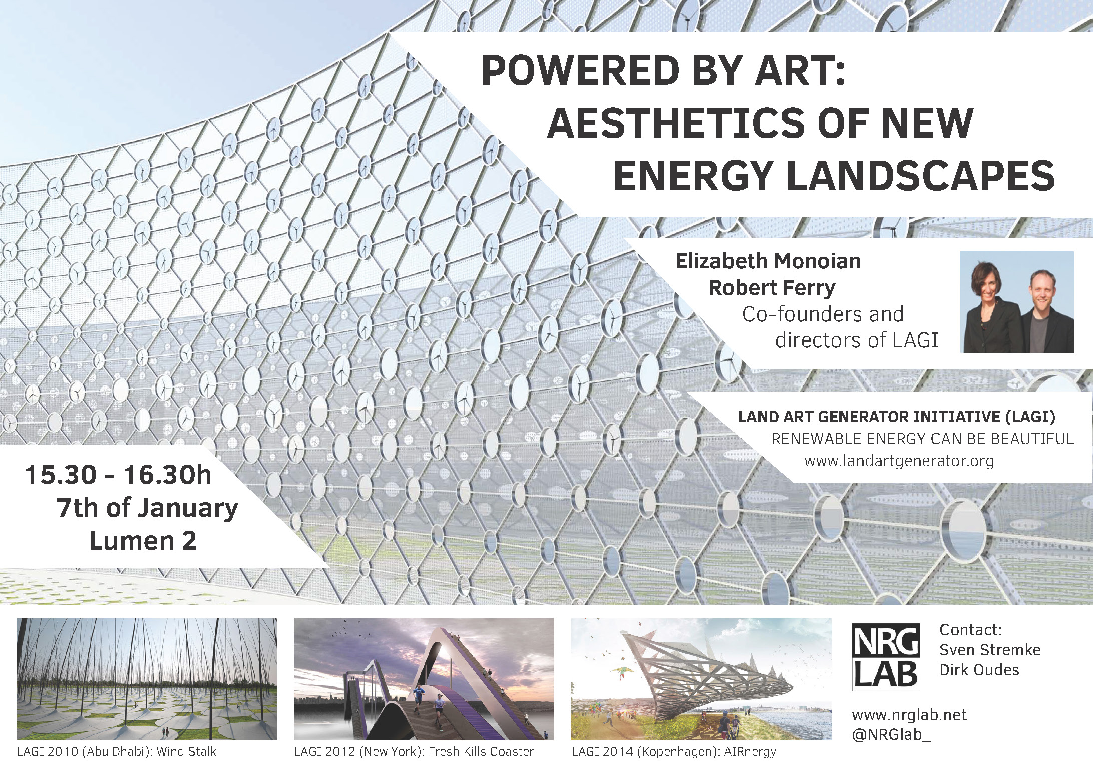 January 7, Elizabeth Monoian and Robert Ferry from the Land Art Generator Initiative (LAGI) will provide an (online) guest lecture to a group of BSc thesis students working on energy-related interventions in Amsterdam. All others are very welcome to join. The lecture entitled ‘Powered by Art: Aesthetics of New Energy Landscapes’ will take place from 15:30 to 16:30 in Lumen 2, campus Wageningen UR, Wageningen (NL). After the talk, there will be time for questions and discussion.