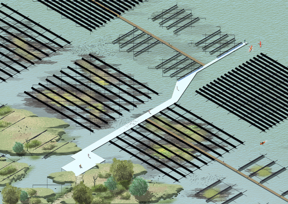 Floating solar panels on a wicker of willow branches: the different modules show a variety of hydrosere and succession stages (image source: David de Boer and Sven Stremke).