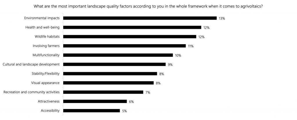 The results indicate a decrease in the experiential value after the implementation of agrivoltaic systems, while the future value shows a slight increase. The use value – the third dimension of landscape quality – increases for the interspace agrivoltaics and declines for the overhead system. Environmental impacts, wildlife habitats as well as health and well-being are rated as the most important factors for the design and implementation of agrivoltaic systems by landscape users. Although respondents support farmers’ involvement in the energy transition and the multifunctional character of agrivoltaics, they express concerns about the impact on wildlife and the decline in the attractiveness of the landscapes. This study suggests directions for further research on the landscape-energy nexus and provides recommendations for the development of landscape-inclusive agrivoltaic power plants.
